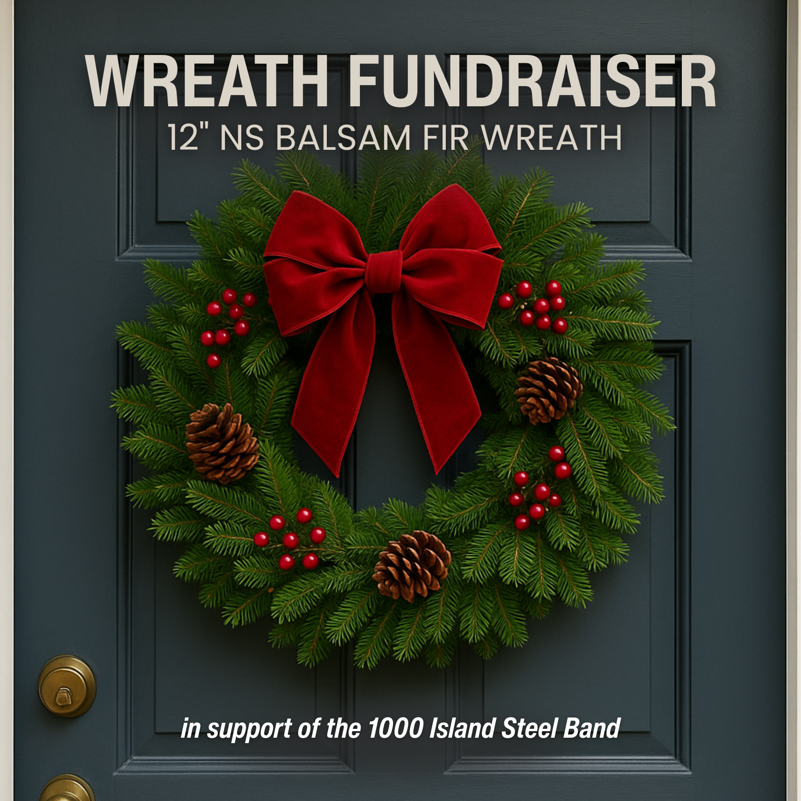 Support the 1000 Islands Steel Band by pre-ordering your premium 12" Nova Scotia Balsam Fir Wreath today!
